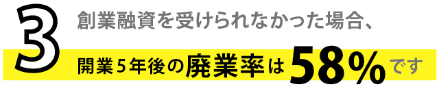 創業融資を受けられなかった場合、開業5年以内の廃業率は約58%と非常に高くなっています。一方、創業融資を受けた場合の開業5年以内の廃業率は約10%。事業にはトラブルがつきものですが、一度経営が苦しくなってからではお金を借りることが非常に難しくなってしまいます。しかし、創業融資をうけとっていれば、そのような難局ものりきりやすくなります。その結果が、廃業リスクが6倍という数字なのです。
